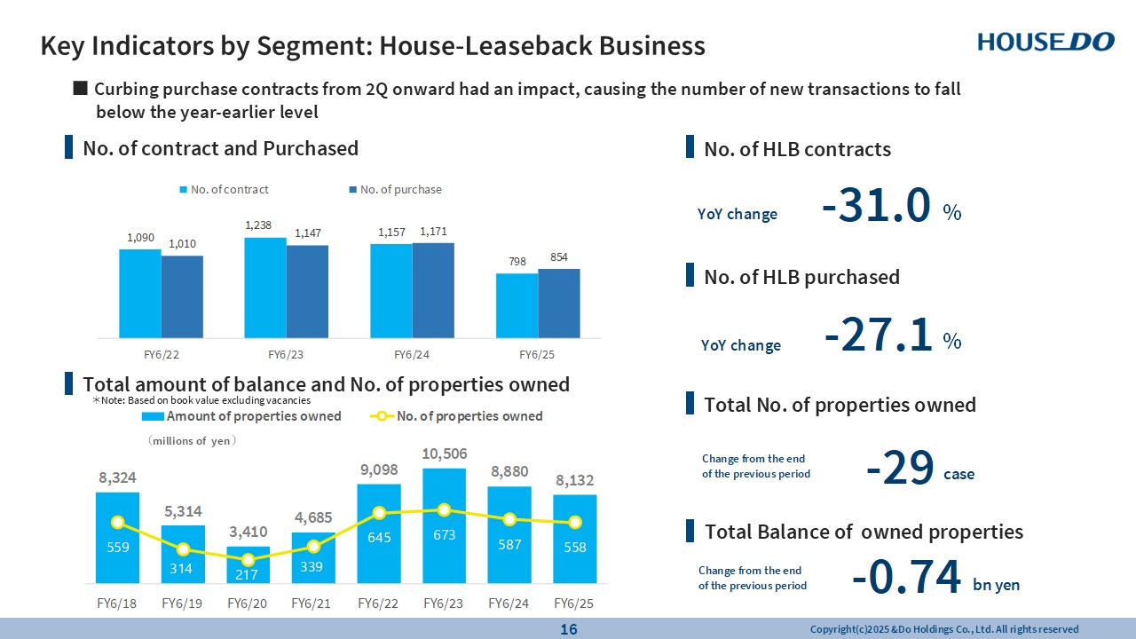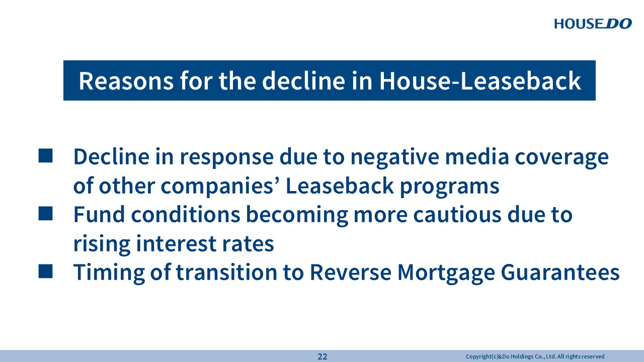 As for the reason behind the downsizing of the House-Leaseback Business, we believe we have addressed this on several occasions: it stems from negative media coverage surrounding leaseback services. In the first half of this year, various media outlets reported on highly problematic practices by certain operators, which led to a decline in inquiries. While we believe inquiries have since recovered, we continue to feel that handling customer relationships in this area has become extremely difficult.