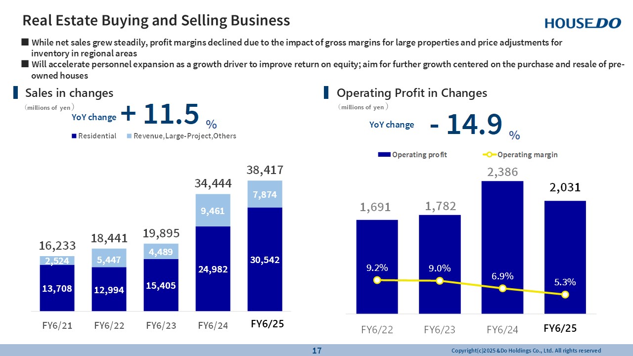 Next is the Real Estate Buying and Selling Business. Here, we will place particular emphasis on strengthening our pre-owned housing operations. I will explain this later.