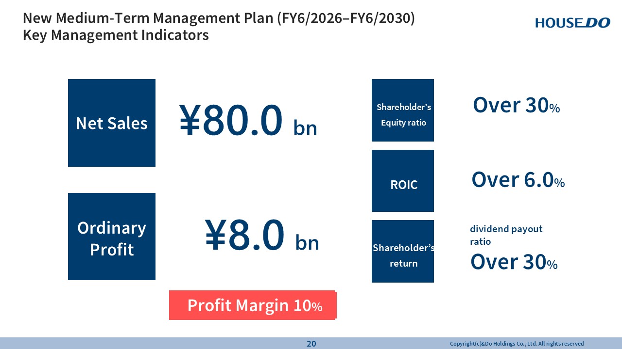 As previously announced, our goal over the next five years is to achieve 80,000 million yen in net sales, 8,000 million yen in ordinary profit, and an ordinary profit margin of 10%.