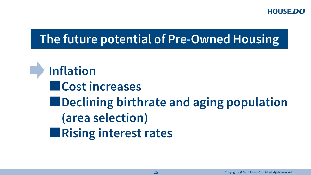 Along with that comes rising costs. In the deflationary period to date, during which everything was highly affordable, building materials were very inexpensive too, and as a result, newly built houses were supplied at very low prices. With both interest rates and material costs at low levels, it was only natural for people to buy newly built houses. However, we are now beginning to see a reversal of that trend. Construction material prices are rising, interest rates are also going up, and newly built houses are becoming harder to sell. In such an environment, we believe demand will increasingly shift toward high-quality pre-owned houses.