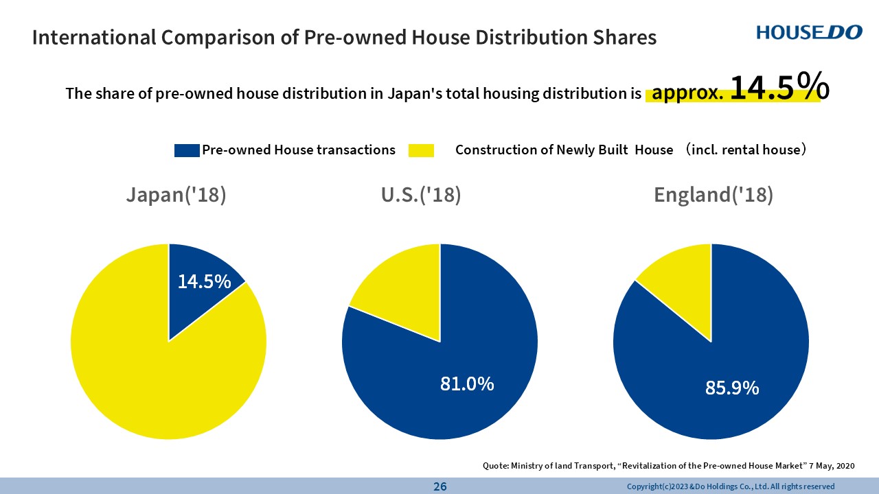 Here is some international data. In terms of pre-owned housing brokerage, Japan stands at 14.5%, compared to 81% in the U.S. and 85.9% in the U.K. Japan has overwhelmingly favored newly built houses, which is unusual. While this was long considered the norm, I myself had always wondered about it.