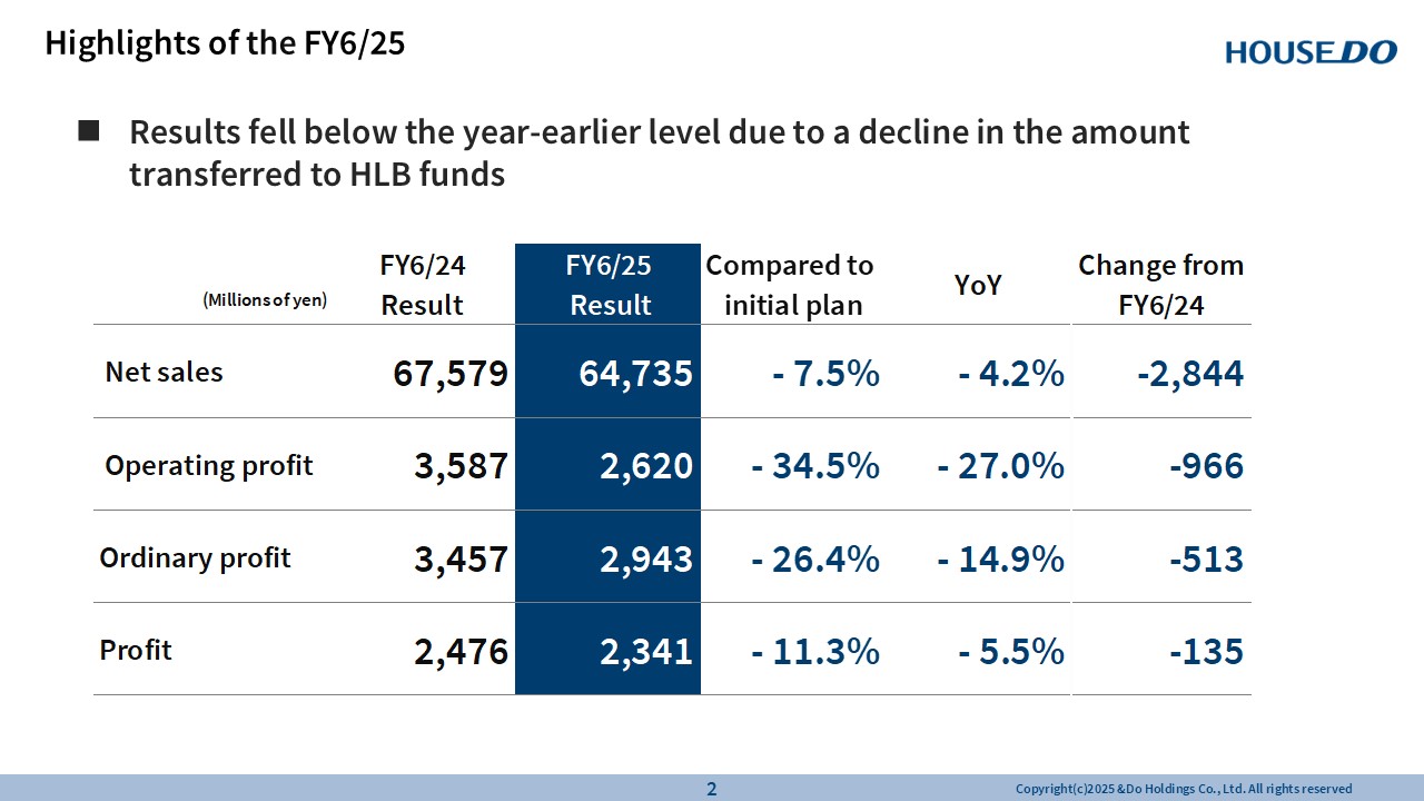 Starting with the key takeaway, both sales and profit declined. As shown, results fell below the year-earlier level due to a decline in the amount transferred to HLB funds.