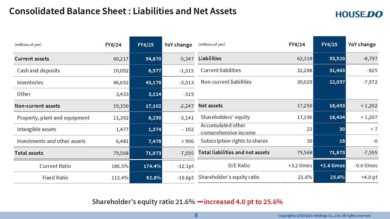 We significantly reduced our total assets. However, as you can see, in the Real Estate Buying and Selling Business, we did not seek to maintain stability through contraction but naturally aimed for higher net sales. As a result, the shareholders’ equity ratio rose significantly by 4.0 pt, reaching 25.6%.