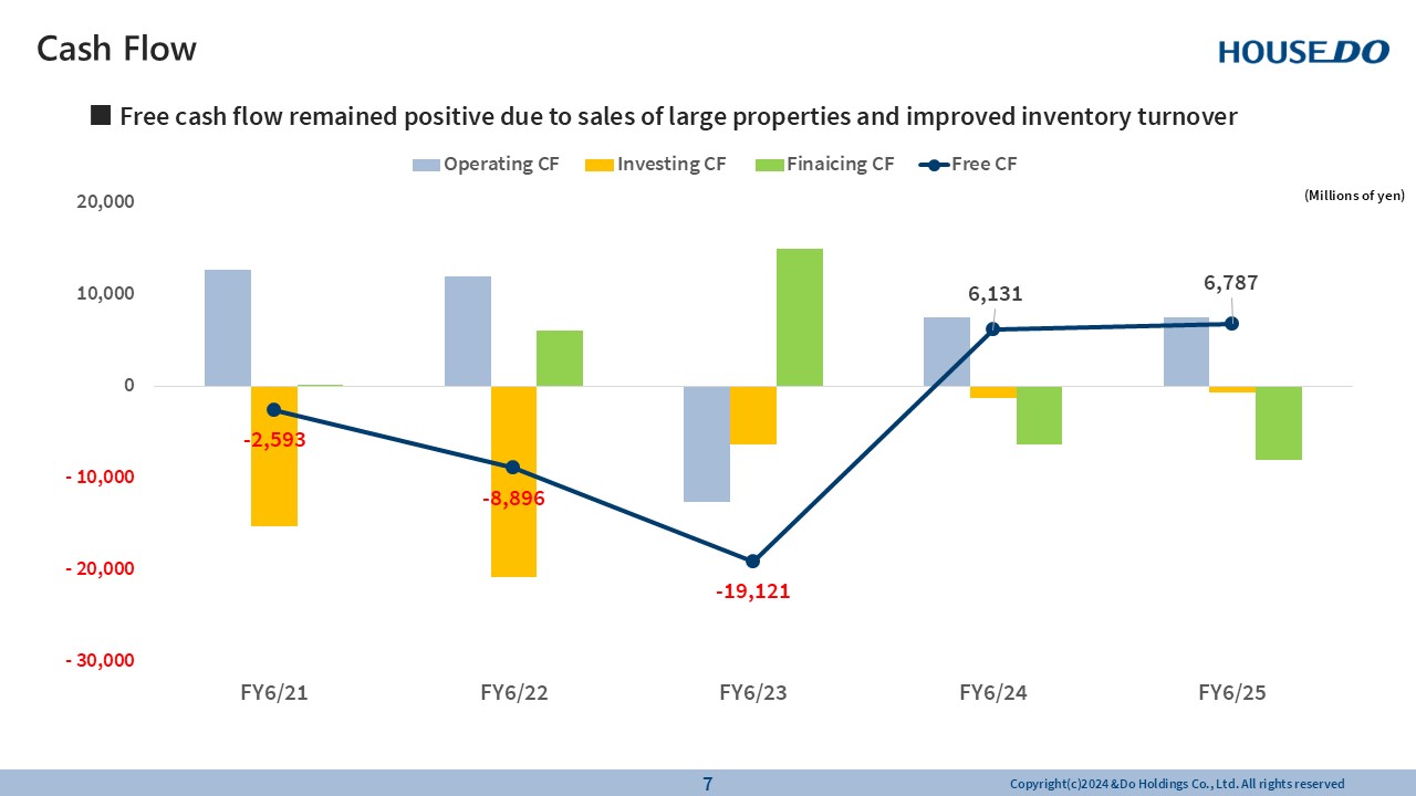 Turning to cash flow, as we have noted in earlier briefings, we have taken on significant challenges under our current medium-term management plan. In order to secure properties, we of course increased borrowings significantly and worked to raise net sales. As a result, from 2021 to 2023, cash outflows from investing activities were considerable, leading to substantial negative free cash flow.
