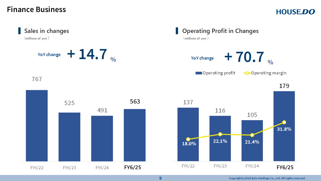 In the fiscal year ended June 30, 2020, the Finance Business still had a high proportion of consumer lending, with net sales of 767 million yen; however, operating profit was low. By the fiscal year ended June 30, 2025, the business has largely transitioned to the guarantee business, resulting in a significant increase in operating profit.