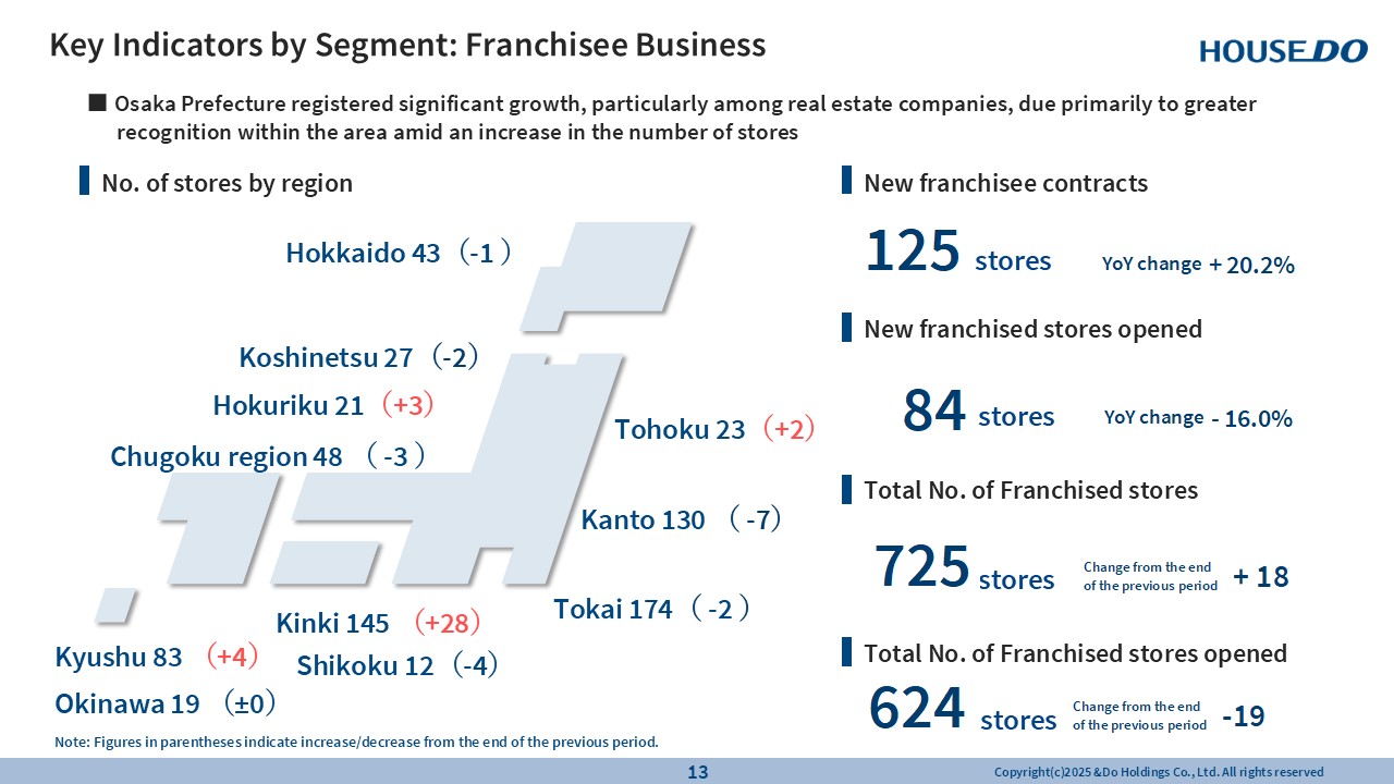 By region, the Kinki area stood out, with an increase of 28 stores, particularly centered around Osaka Prefecture, where franchisee contracts have been performing very well.