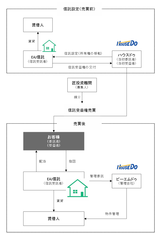 不動産事業を全国で展開する株式会社ハウスドゥ(本社:東京都千代田区 代表取締役社長 CEO 安藤正弘/以下「ハウスドゥ」)は、住みながらその家を売却できるサービス「ハウス・リースバック」の提供を通じて取得、保有する不動産(以下、「ハウス・リースバック不動産」)について、株式会社エスクロー・エージェント・ジャパン信託(東京都千代田区 代表取締役 今中弘明/以下「EAJ 信託」)を受託者として信託受益権化し、匠投資顧問株式会社(東京都千代田区 代表取締役 矢野英明/以下「匠投資顧問」)へ販売(私募取扱い)の委託を行うことについて合意いたしましたので、お知らせいたします。